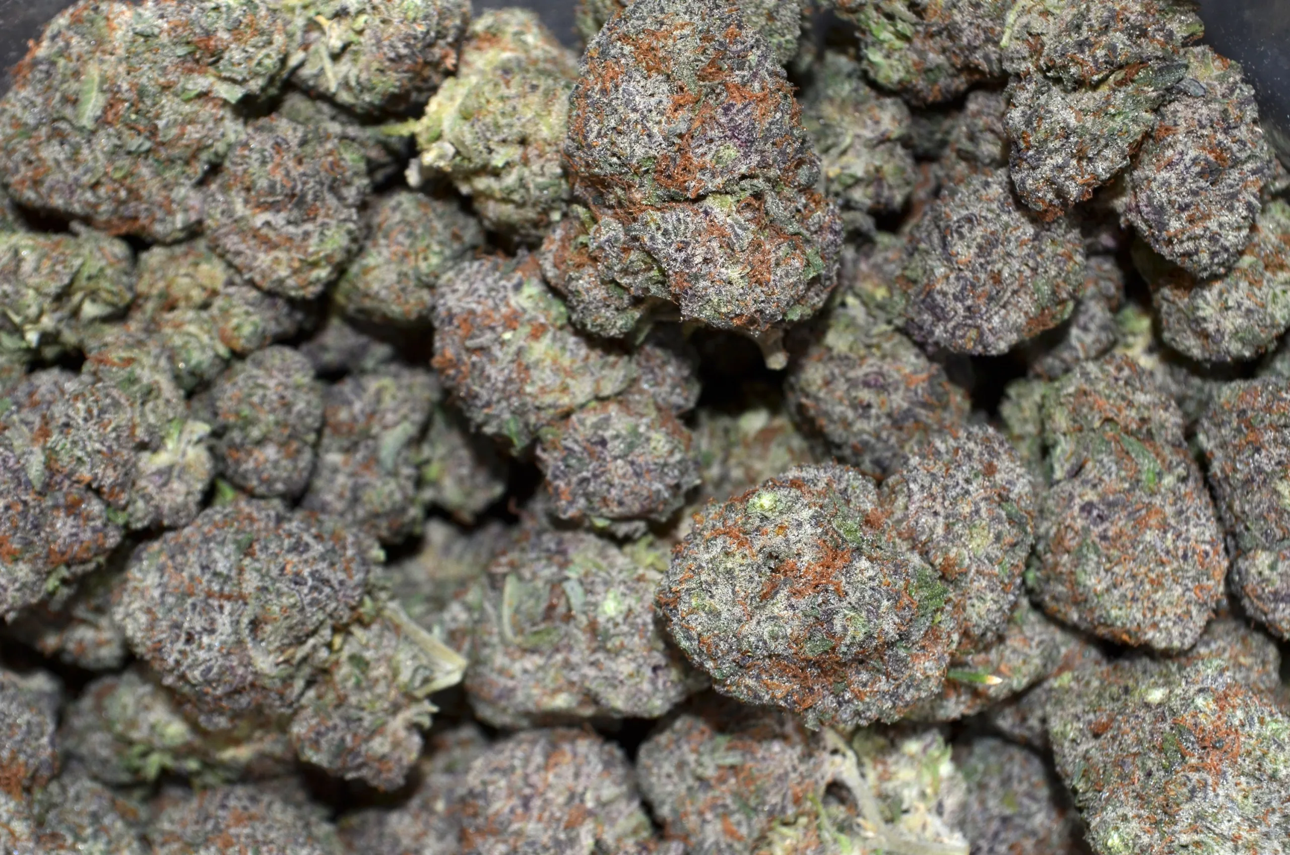 The bag appeal on this AAAA batch is simply exceptional. The buds are uniquely structured—dense, chunky, and shaped like miniature spades. The foliage features a striking contrast of deep forest greens intermingled with flashes of royal purple that emerge during the final cooling phase of cultivation. Every inch of the flower is tightly woven with bright, rust-colored pistils and heavily caked in a thick, sticky layer of cloudy trichomes. You will definitely want to use a quality grinder for this sticky, resinous flower.